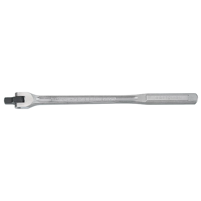 La poignée articulée Craftsman(MD) procure un effet de levier supplémentaire, davantage de prise pour plus de couple. Robuste, elle est fabriquée en acier, et est munie de grandes marques pour une identification rapide de l’accessoire et d’un fini chromé résistant à la rouille. La barre à prise de 1/2 » (13 mm) mesure 15 » (38 cm), est conforme ou dépasse les normes de IASME et est couvert par une garantie à vie.