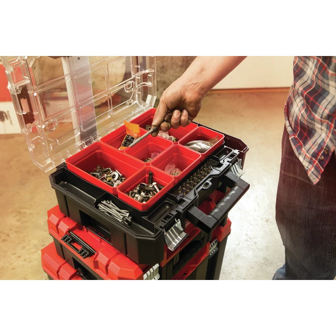 Une unité de rangement pratique, partout où vous allez; voilà ce que vous offre cette tour de rangement portative Craftsman(MD)! Fabriquée en plastique robuste et durable, elle est composée de trois coffres de rangement qui peuvent s’empiler les uns sur les autres et se verrouiller en place au moyen de loquets situés sur les côtés. Simplifiant l’accès à son contenu et l’organisation de celui-ci, cet ensemble de trois coffres de rangement est doté d’une poignée et de grandes roues, ce qui vous permet de facilement déplacer de lourdes charges jusqu’à votre lieu de travail. Garantie à vie limitée.