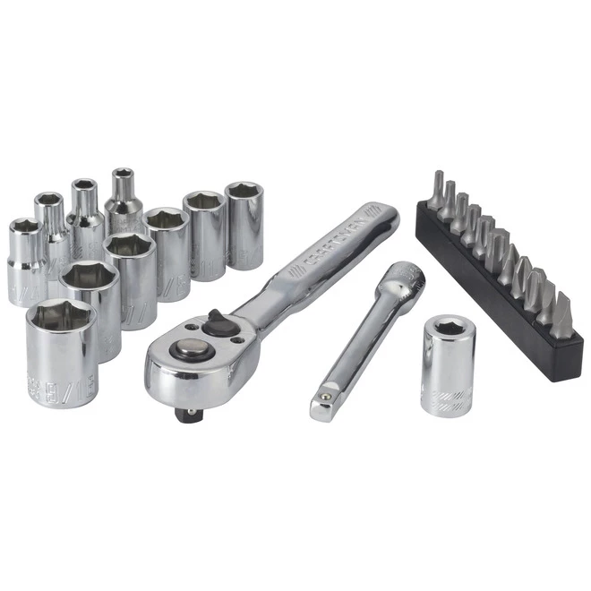 | Inclus | 10 douilles 6 PT à entraînement 1/4 po SAE (5/32, 3/16, 7/32, 1/4, 5/16, 11/32, 3/8, 7/16, 1/2 , 9/16 po), 1 rallonge d'entraînement de 1/4 po (3 po), 1 adaptateur d'embout à entraînement de 1/4 po, 1 cliquet à tête de poire à entraînement de 1/4 po et 11 embouts spécialisés |