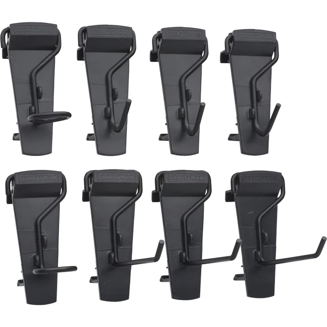 Les crochets Craftsman(MD) s’installent sur le rail de rangement VersaTrack pour créer un système de rangement modifiable aux besoins. L’ensemble comprend une variété de 8 crochets pour ranger des outils manuels ou d’items légers. Les crochets s’installent sur le rail sans outils et peuvent supporter 2 à 5 lb. Ce produit est couvert par une garantie limitée de 1 an.
