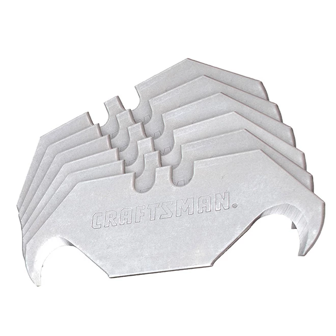Cet ensemble de 5 lames de Craftsman(MD) comprend des lames à grand crochet pour ouvrir les emballages et découper la toiture, la tuile, le tapis, le tissu et autres matériaux épais. La forme des lames permet d’éviter d’endommager la surface sous les matériaux à couper. Conviens à la plupart des couteaux universels standards.